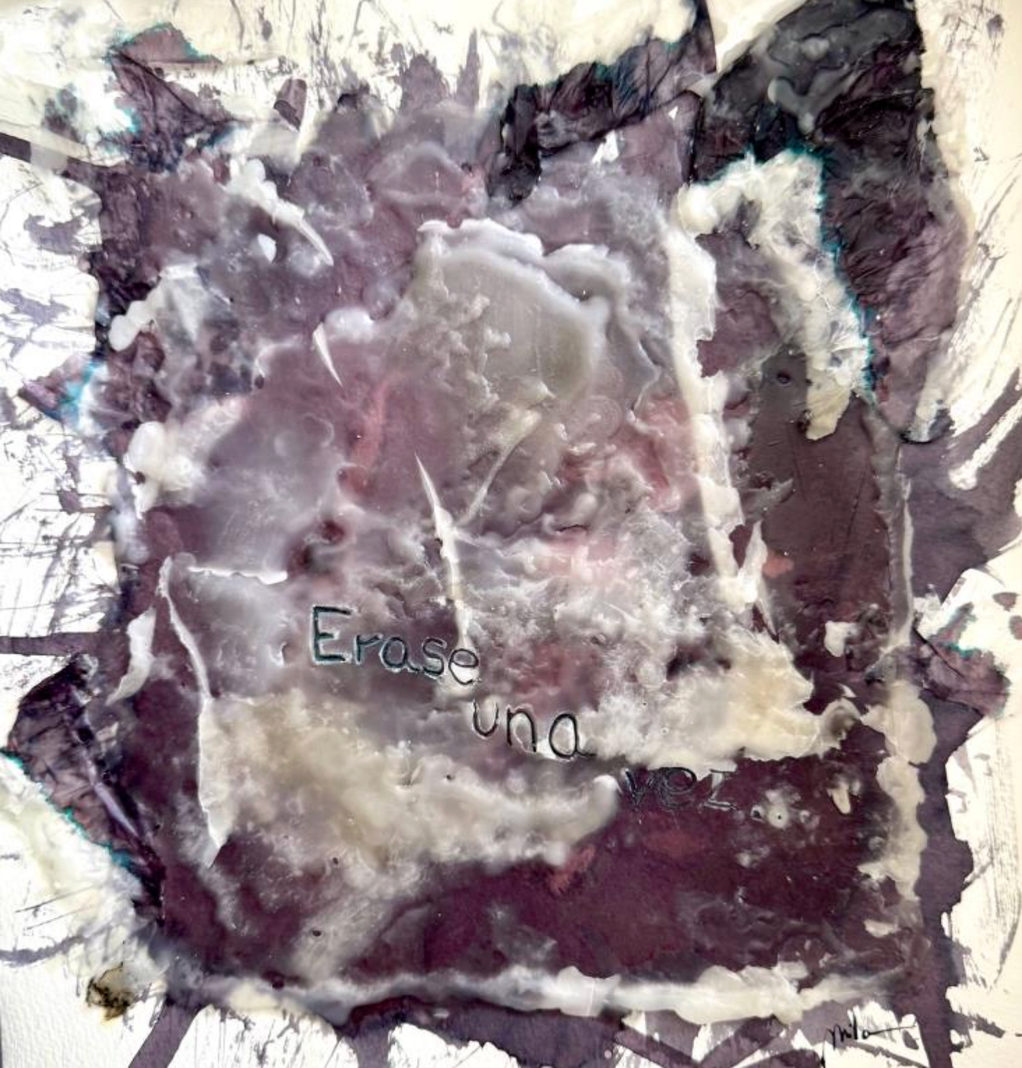 Técnica mixta: dibujo a pluma sobre papel, papeles absorbentes y cera