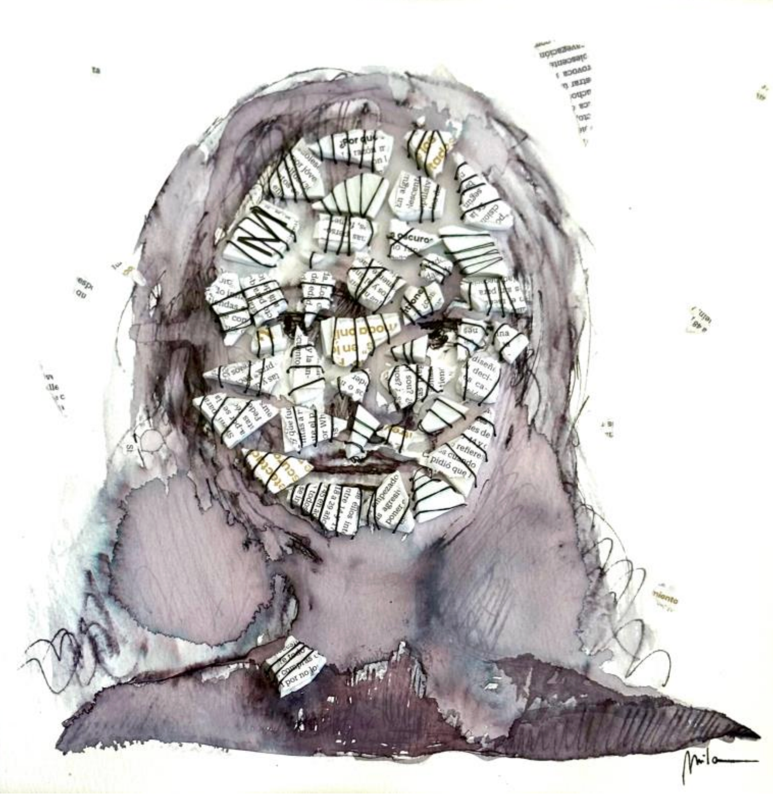 Técnica mixta: dibujo a pluma sobre papel, loza, hilo, papel de periódico
