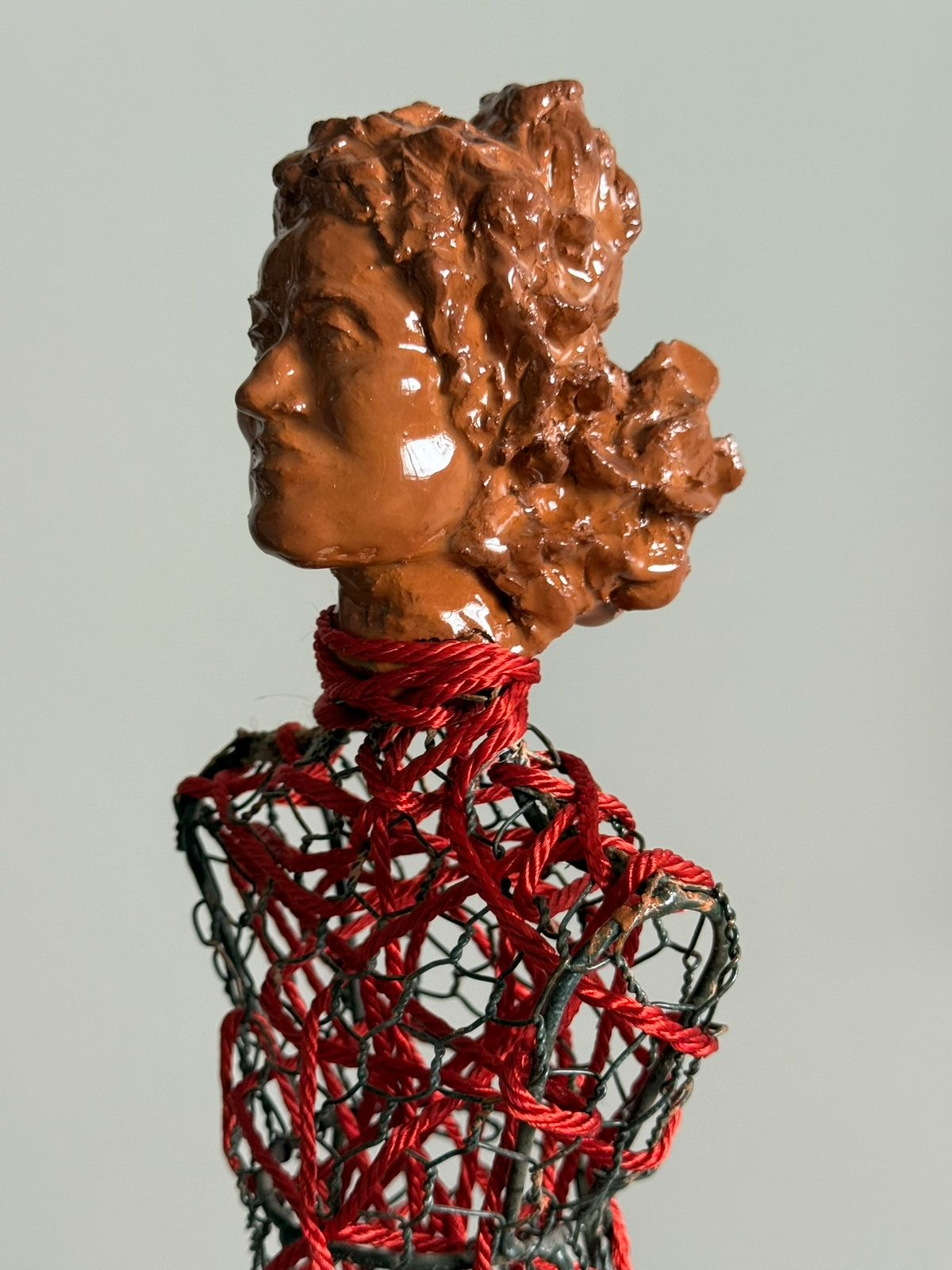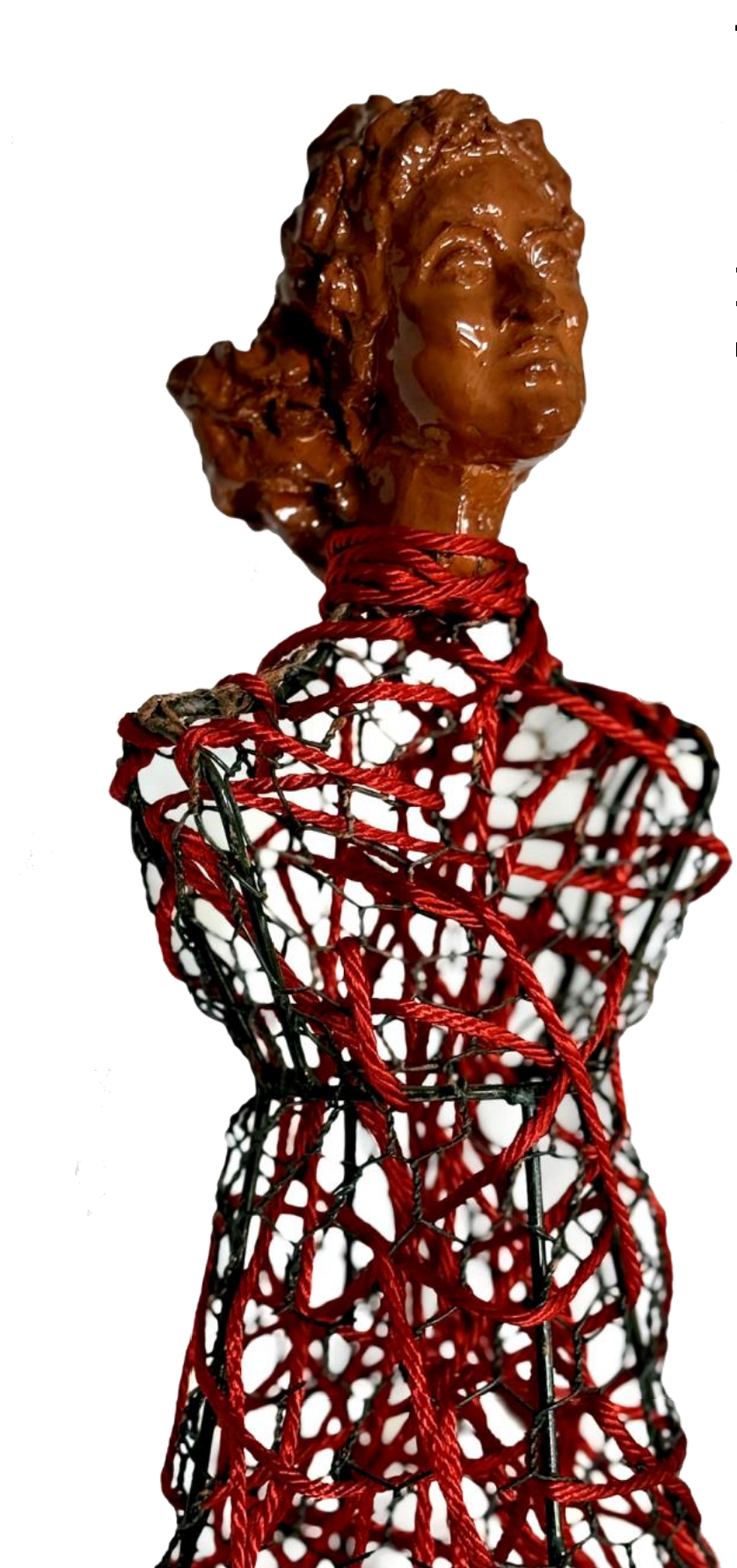 Técnica mixta: malla metálica, lana roja, barro y madera